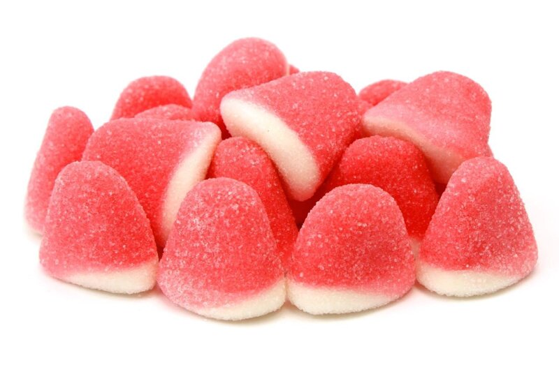 Bacio Fragola, caramelle gommose zuccherate bianco rosa. Dolci baci Kiss soffici, golosi e profumati con una deliziosa combinazione di gusto fragola e panna. Caramelle gommose sfuse in sacchetto da Gr 100 .