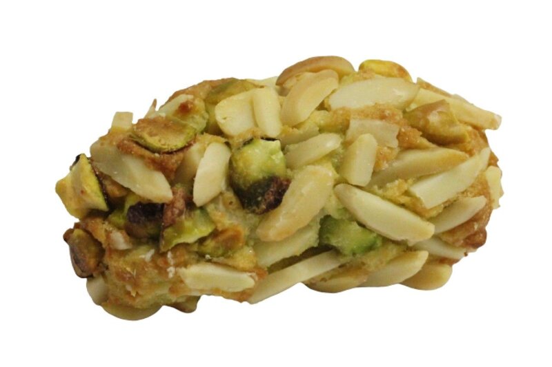 Pasta di mandorle cornetti al pistacchio con lamelle e granella di pistacchio. Paste di mandorla fatte a mano utilizzando materie prime di qualita' e ingredienti tipici della tradizione siciliana. Confezione gr 250