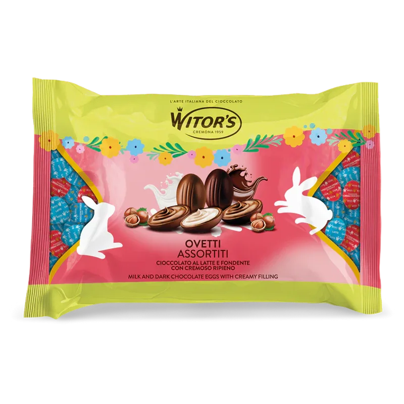 PRALINE DI CIOCCOLATO AL LATTE CON CREMOSO RIPIENO. Ingredienti: zucchero, grassi vegetali (cocco, palmisti, palma – in proporzione variabile), pasta di cacao, latte intero in polvere, burro di cacao, siero di latte in polvere, lattosio, cacao magro in polvere, nocciole (0,4%), emulsionante: lecitina di soia, aromi. CACAO NON UE. Può contenere tracce di altra frutta a guscio, uova e glutine. CONSERVARE IN LUOGO FRESCO E ASCIUTTO.