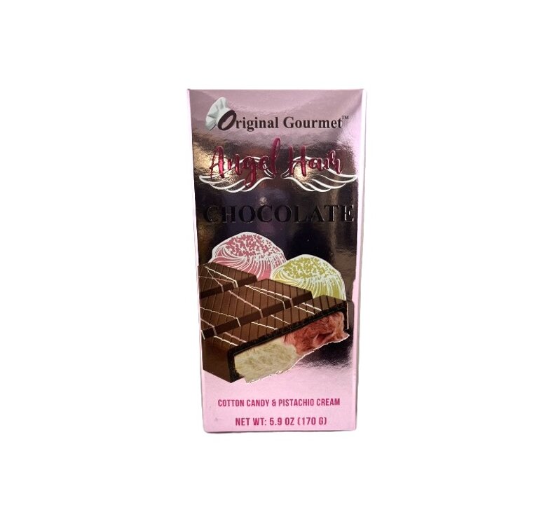 La Dubai Angel Hair è una barretta virale, evoluzione della classica "Dubai Chocolate", composta da un guscio di cioccolato bianco (spesso aromatizzato al lampone e colorato di rosa) ripieno di una voluminosa crema al pistacchio e