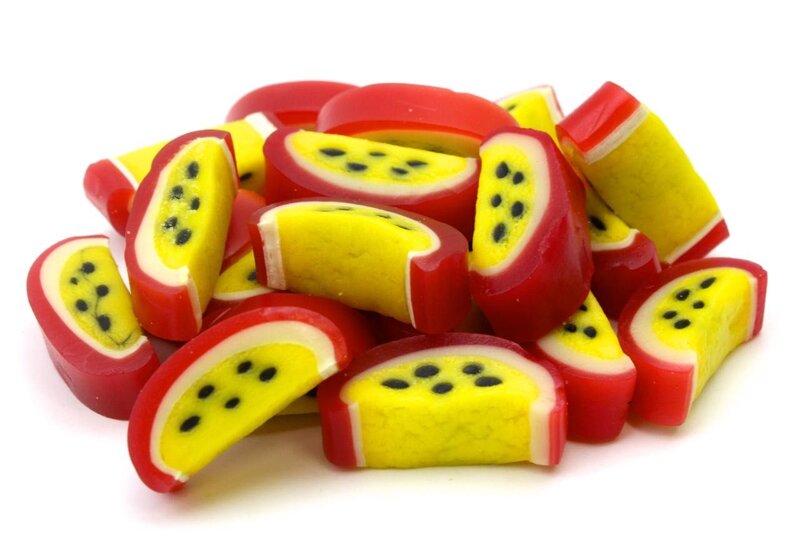 Frutto della passione ,liquirizia gommosa a forma di spicchio di frutto della passione gusto frutto della passione. Frutto della passione a fette con bordo di impasto tipo liquirizia e ripieno morbido.