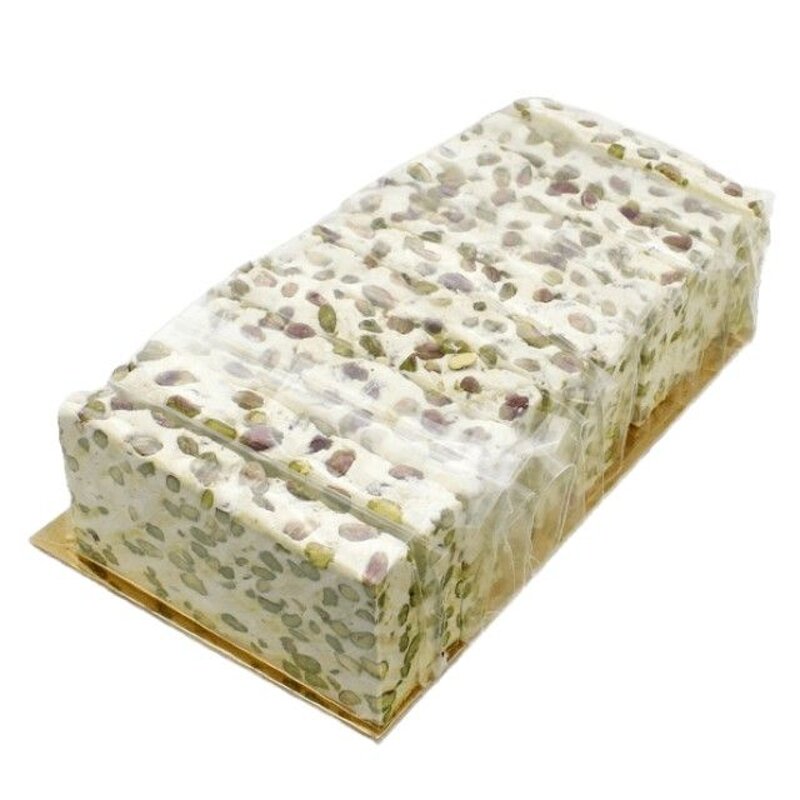 Torrone tenero pistacchio a fette in formato pretagliato. Torta di torrone da 12 fette in vassoio da 150 gr . Torrone di produzione artigianale con fette sfuse divise da una velina di cellophane alimentare ideale per pasticcerie, gastronomie, banchi dolci.